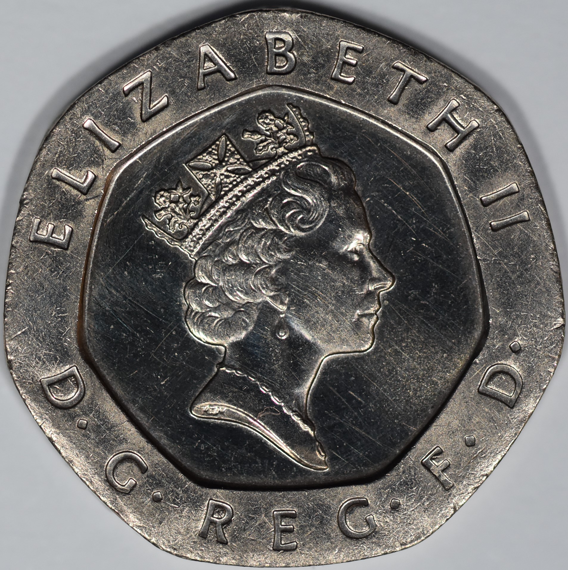 GB Decimal | Twenty Pence | G3 | | 1999 | | Plain - 7 sided | | Extremely Fine | 73,478,750 |  Queen Elizabeth II (Ian Rank-Broadley) |  Crowned Tudor Rose (William Gardener) | 4 |